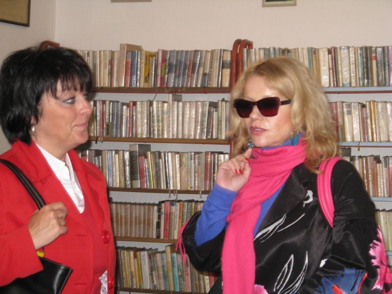 v knihovně zleva pracovnice Jihočeské vědecké knihovny, herečka paní Asterová
